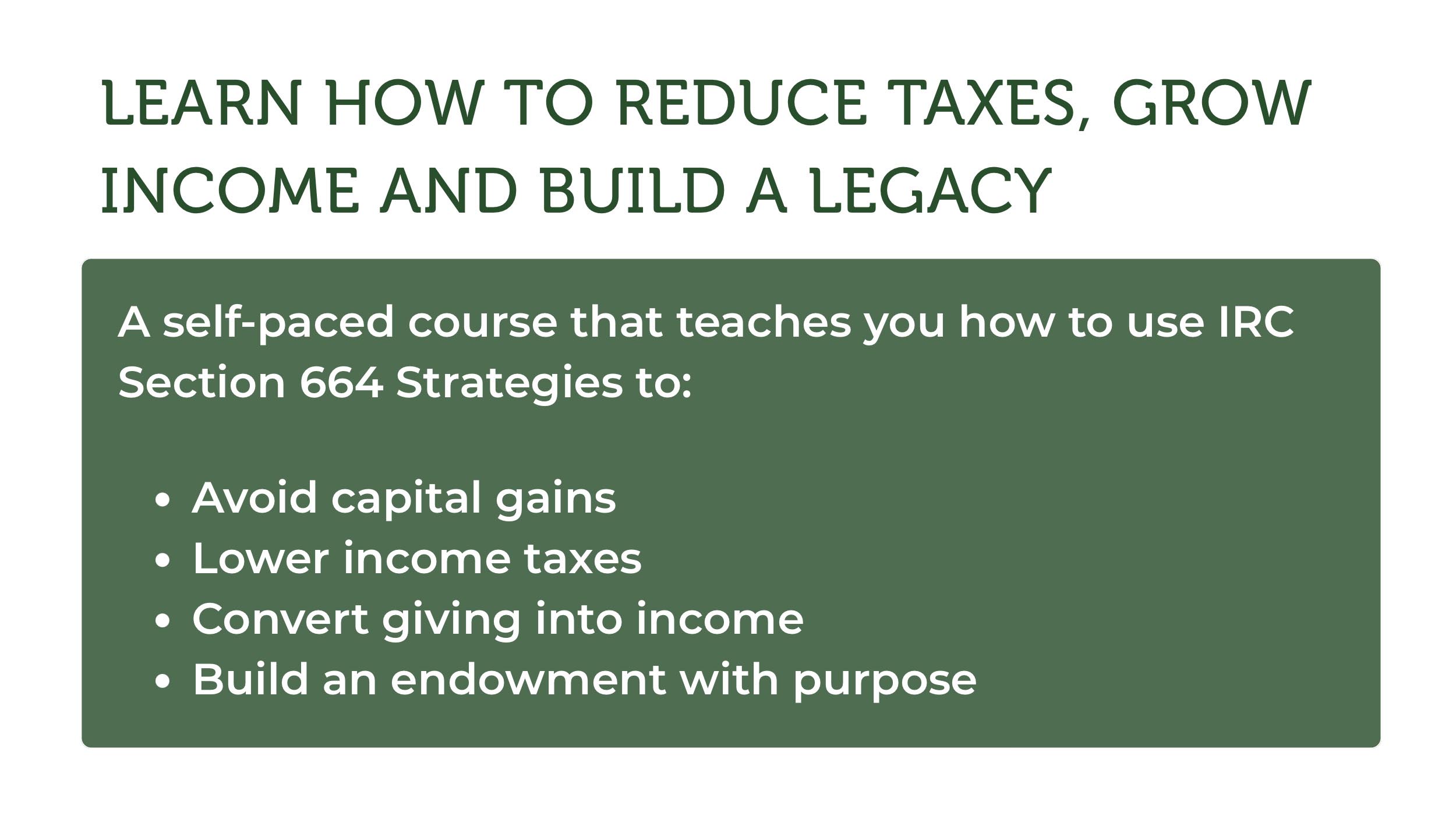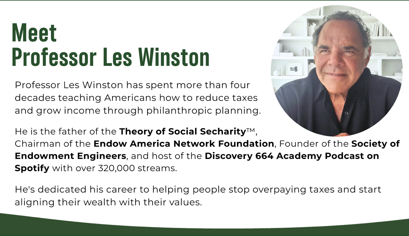 The 664 Ambassador Course teaches the same tax-smart strategies that experienced advisors and legacy-minded individuals have used for decades to avoid capital gains taxes on appreciated assets, reduce taxable income without lowering their lifestyle, and generate income through charitable structures defined in the Internal Revenue Code. You'll discover how to reallocate retained earnings from a C-Corporation, exit appreciated assets like stock or real estate without triggering massive capital gains, and build a personal endowment that aligns wealth with long-term purpose.